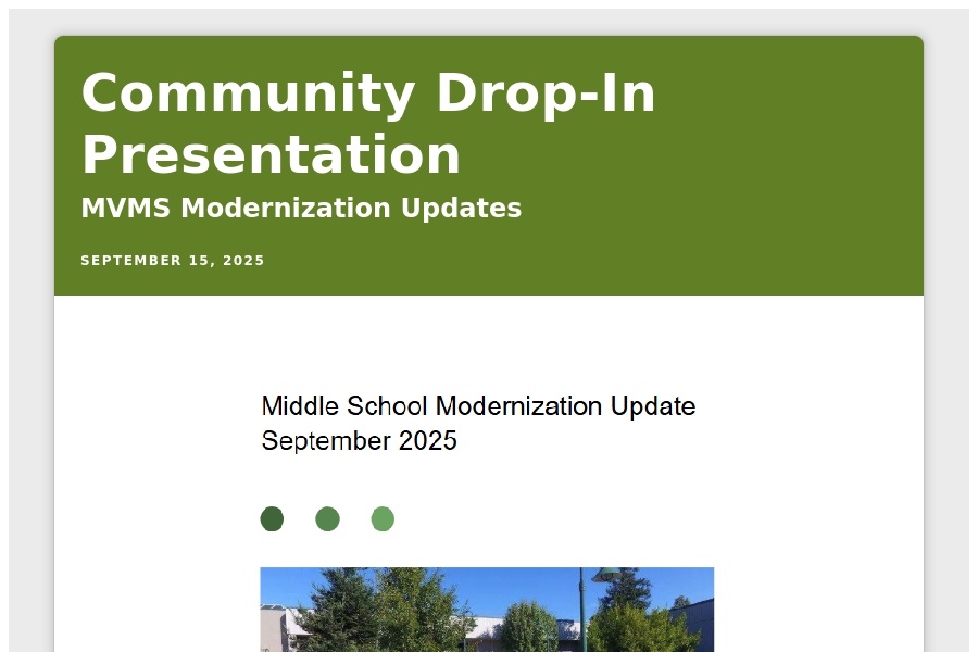 Community Drop-In Presentation MVMS Modernization Updates September 15, 2025 You're Invited to Learn More Superintendent Elizabeth Kaufman and the di. . .